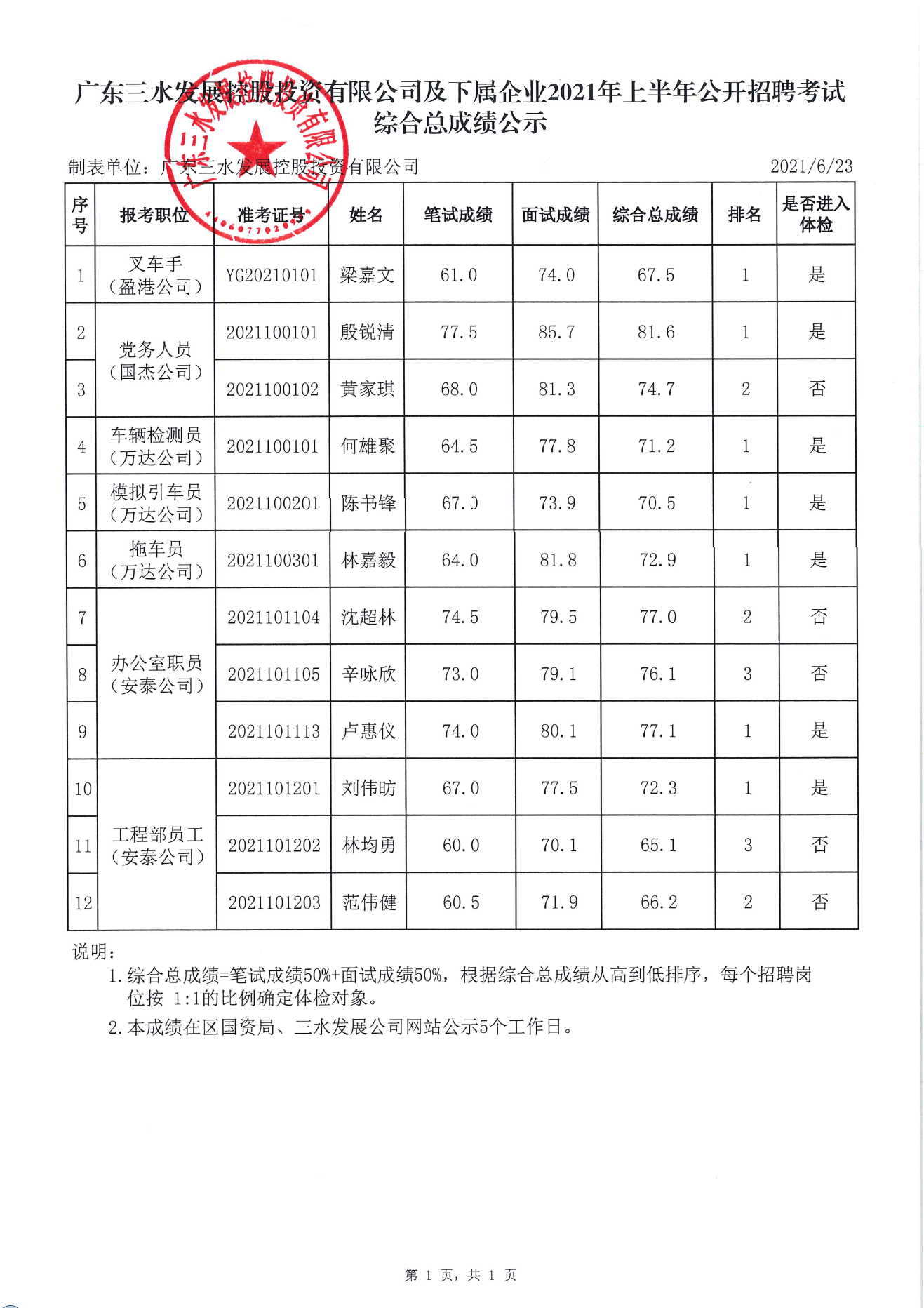 广东williamhill中文官网控股投资有限公司及下属企业2021年上半年公开招聘考试综合总成绩公示