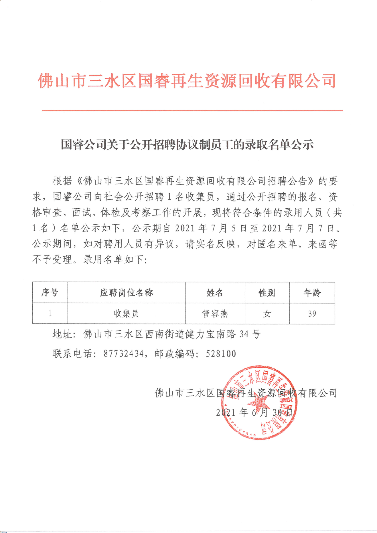 国睿公司关于公开招聘协议制员工的录取名单公示 2021.06.30