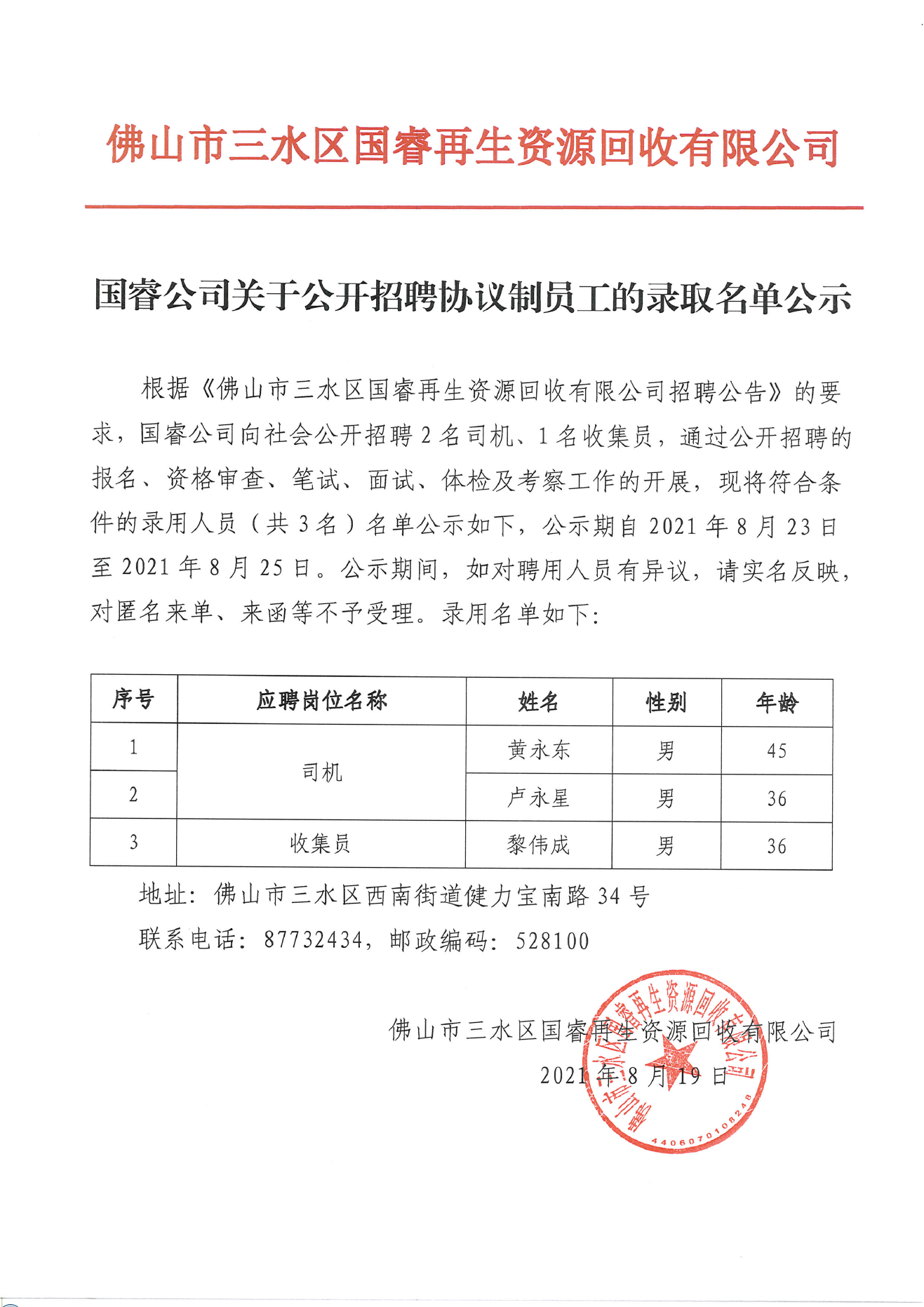 国睿公司关于公开招聘协议制员工的录取名单公示