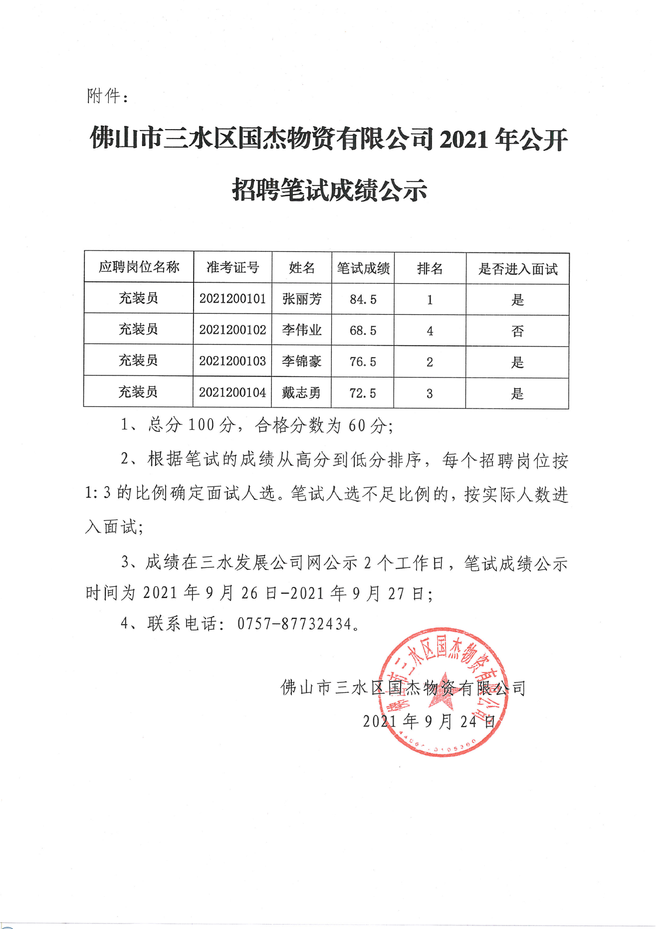 佛山市三水区国杰物资有限公司2021年公开招聘笔试成绩公示