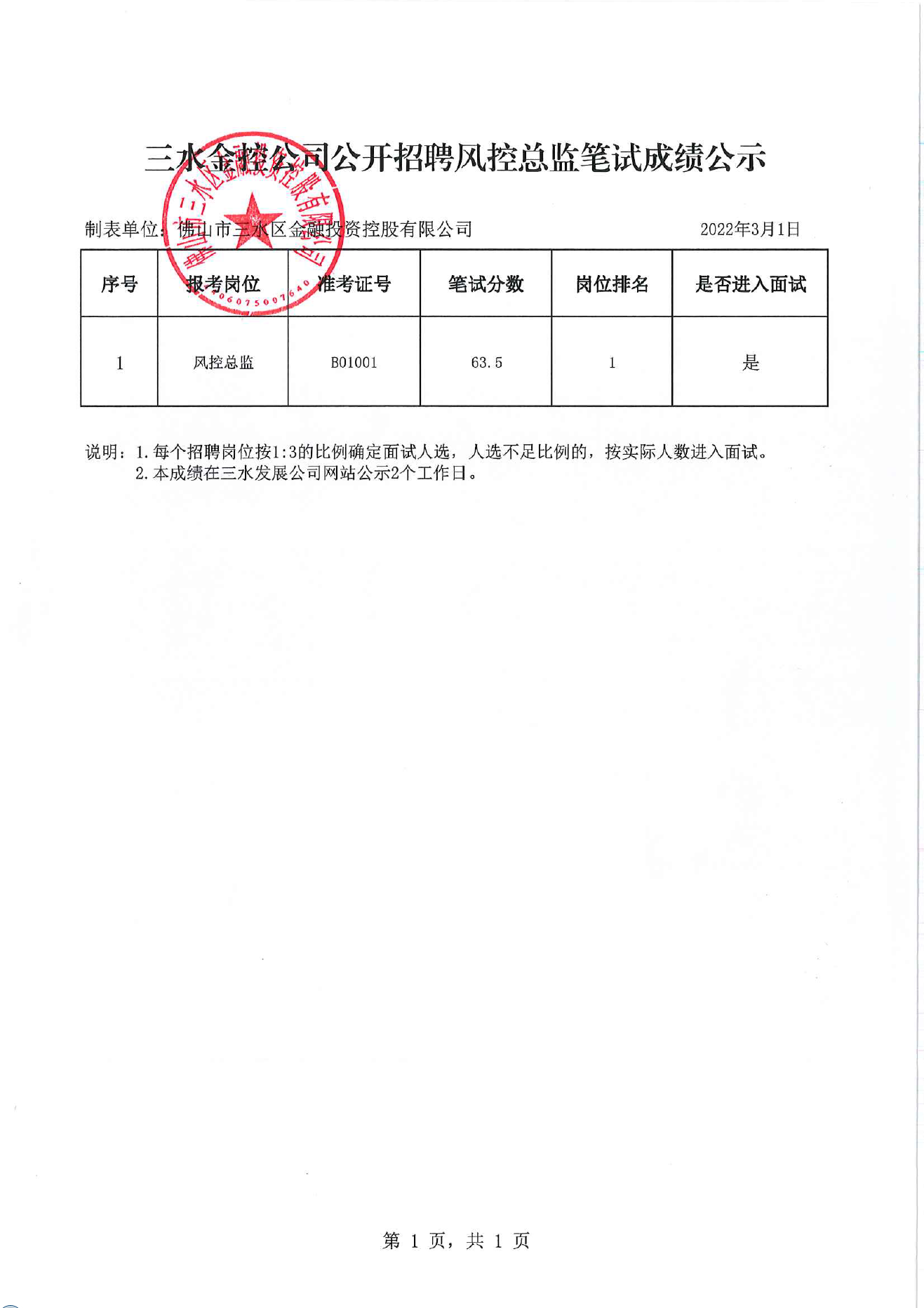 三水金控公司公开招聘风控总监笔试成绩公示