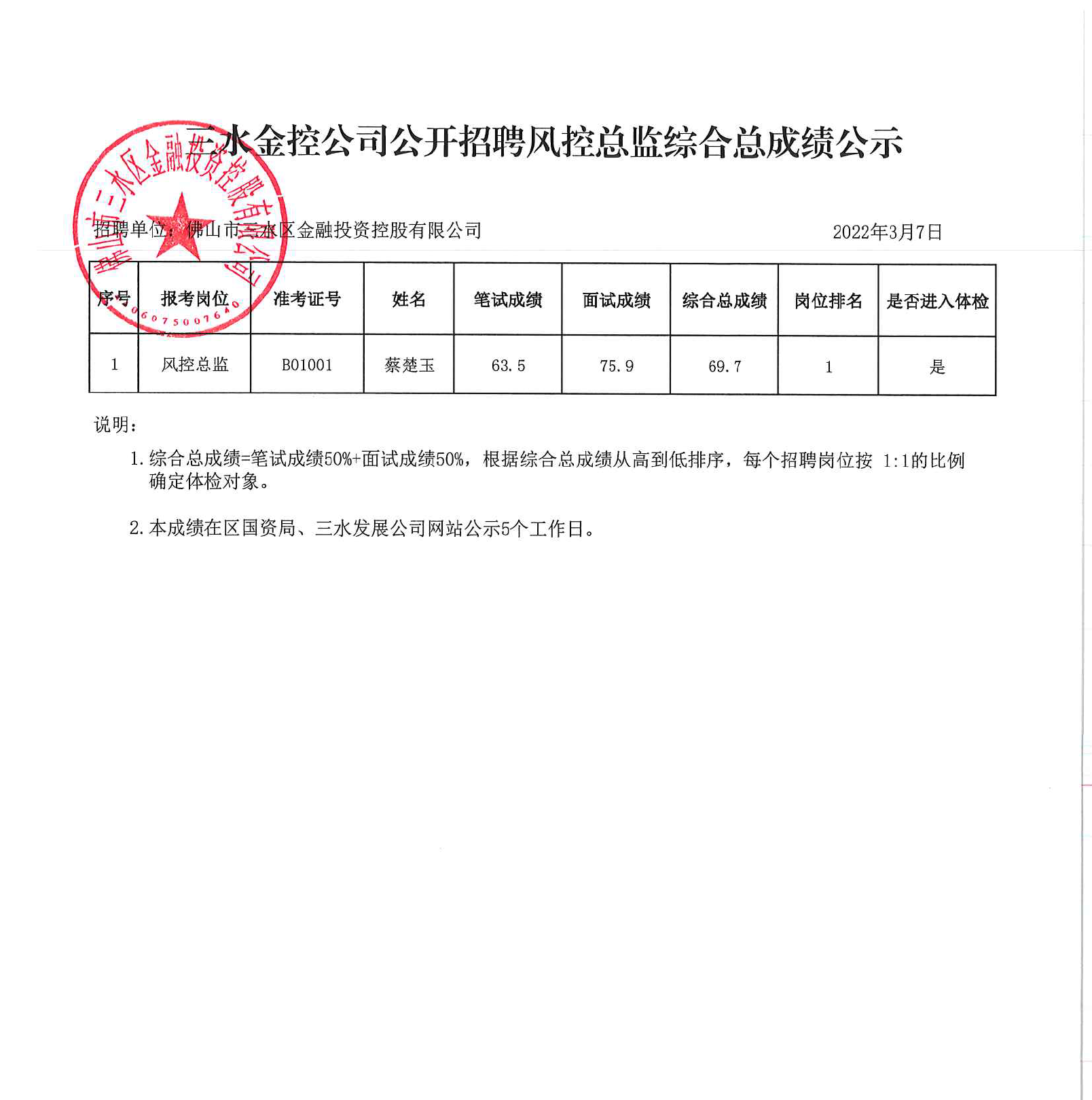 三水金控公司公开招聘风控总监综合总成绩公示