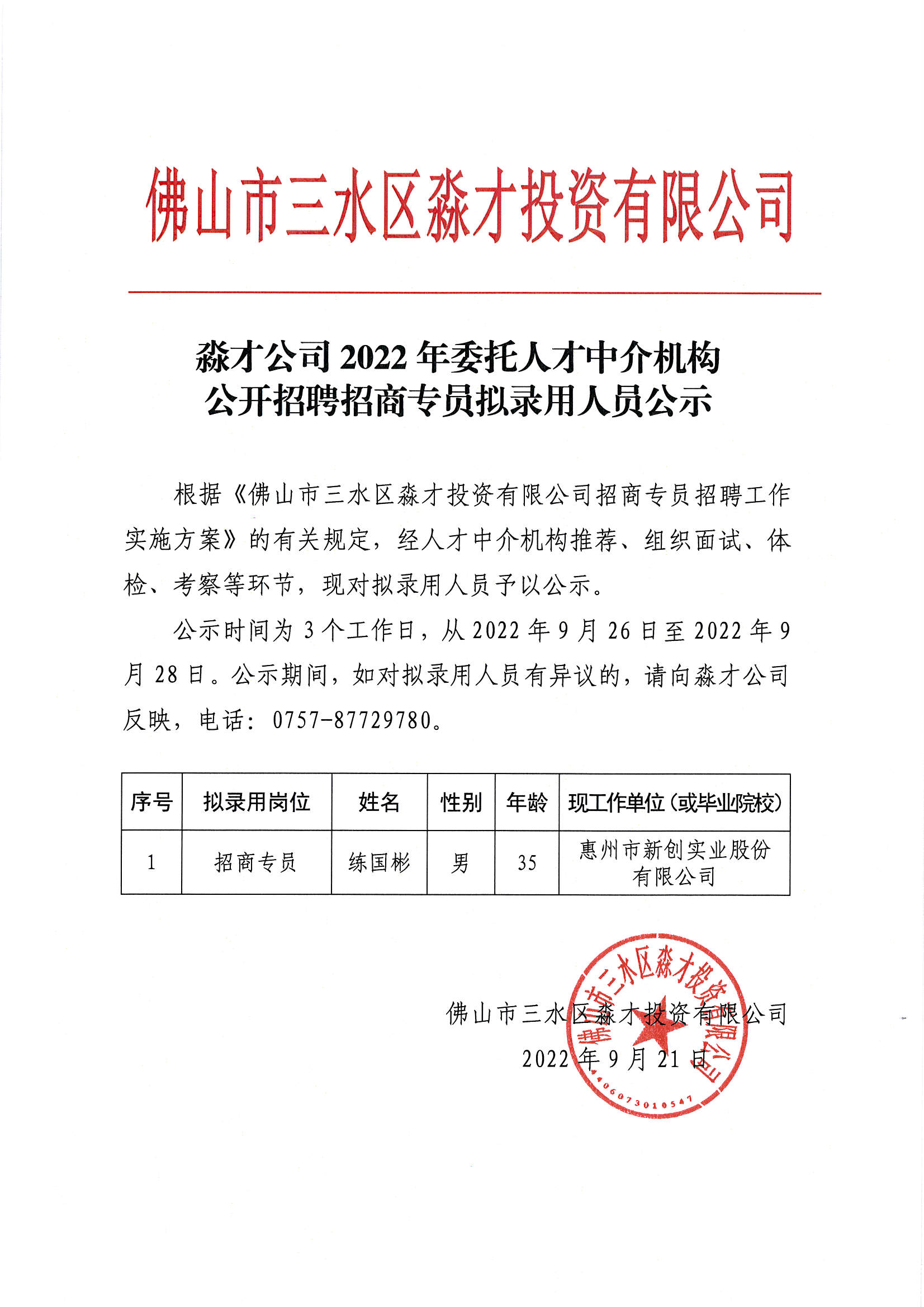 淼才公司2022年委托人才中介机构公开招聘招商专员拟录用人员公示