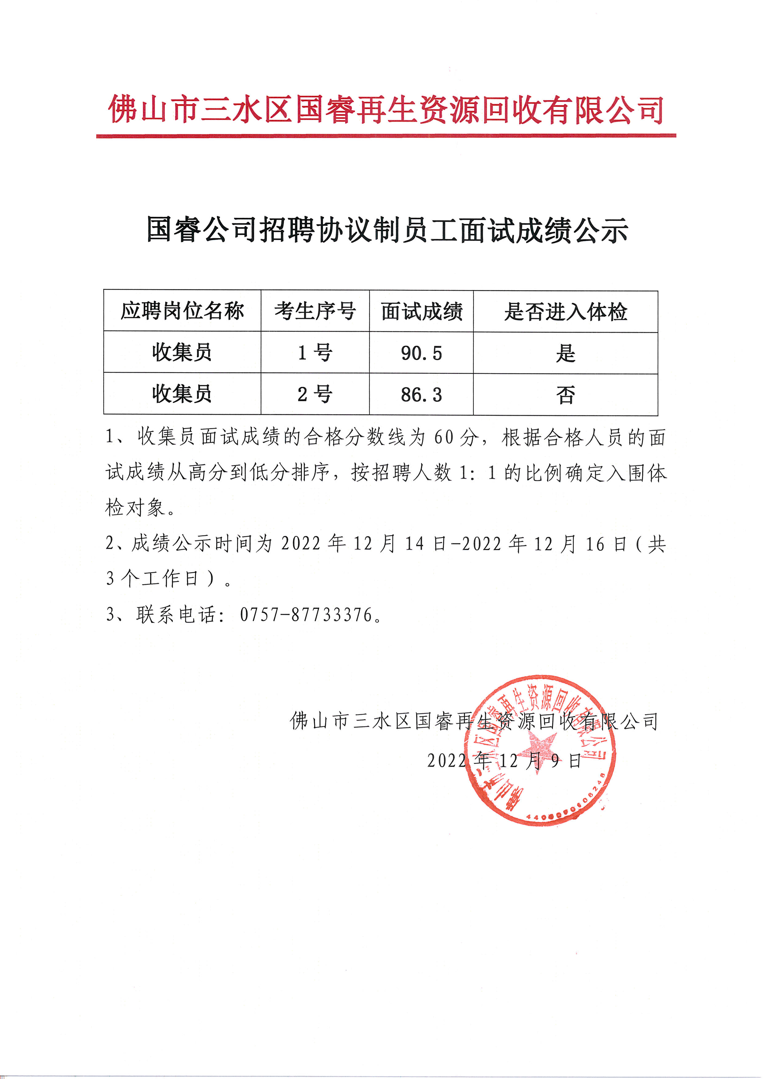 国睿公司招聘协议制员工面试成绩公示