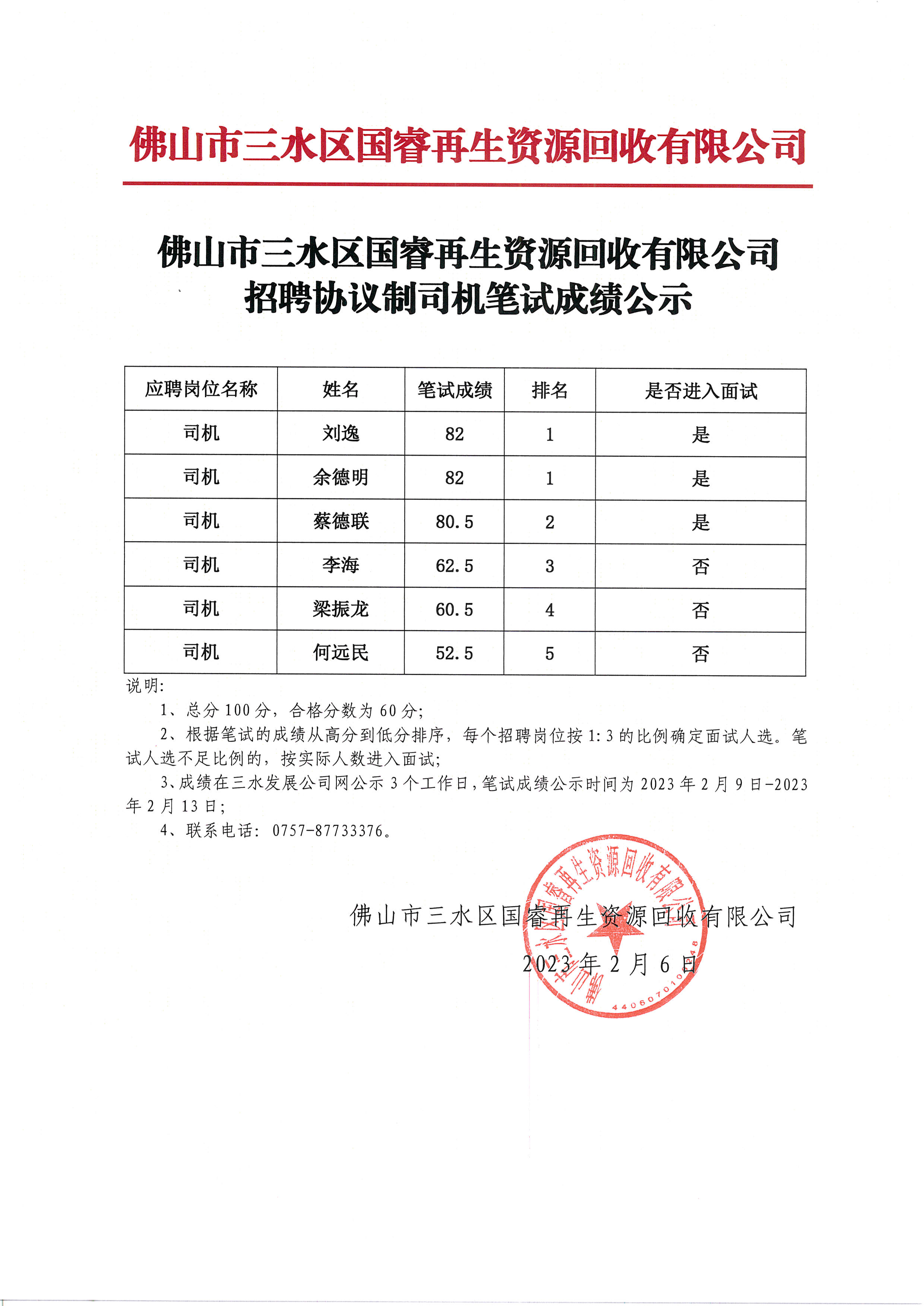 佛山市三水区国睿再生资源回收有限公司招聘协议制司机笔试成绩公示