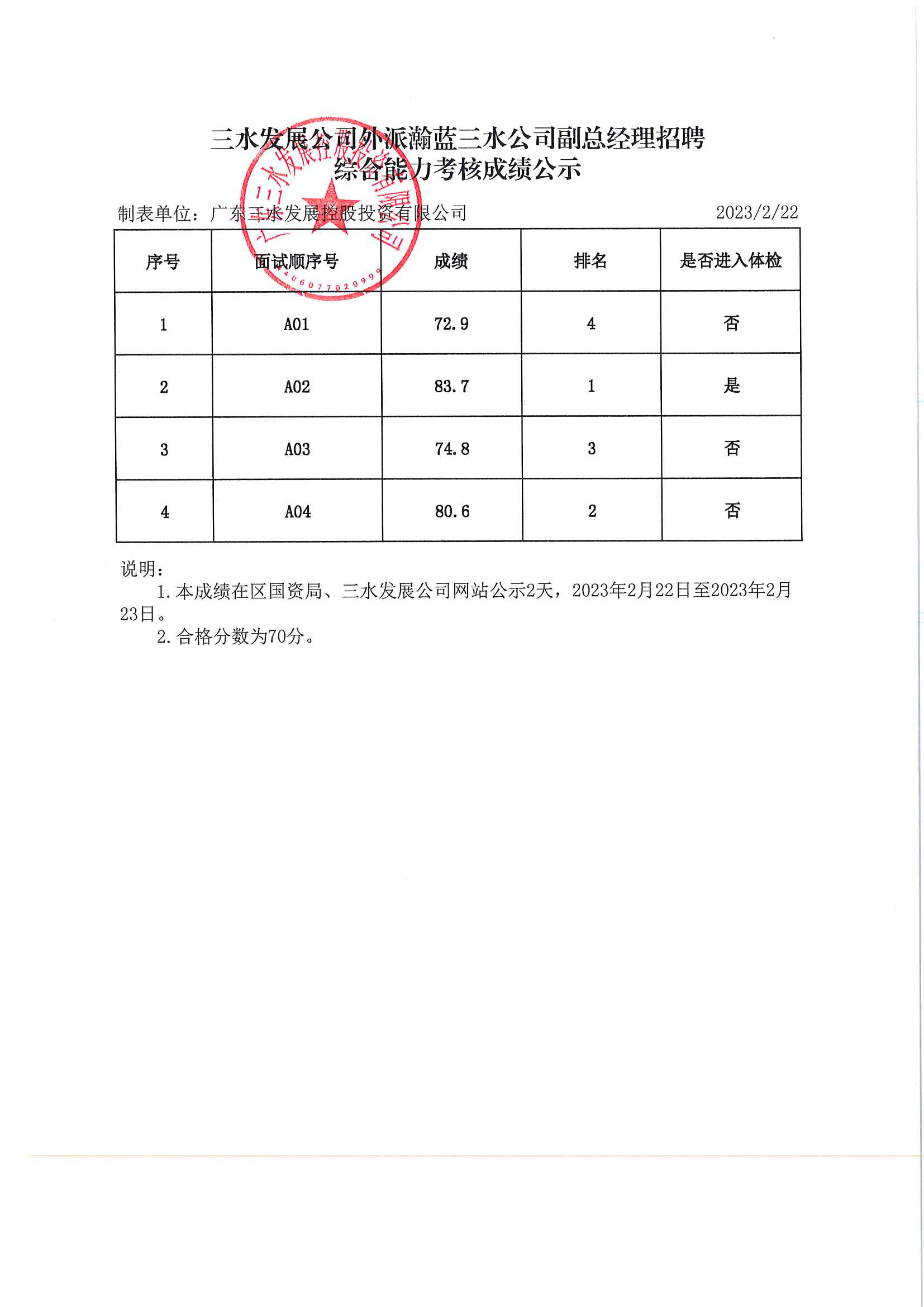 williamhill中文官网公司外派瀚蓝三水公司副总经理招聘综合能力考核成绩公示
