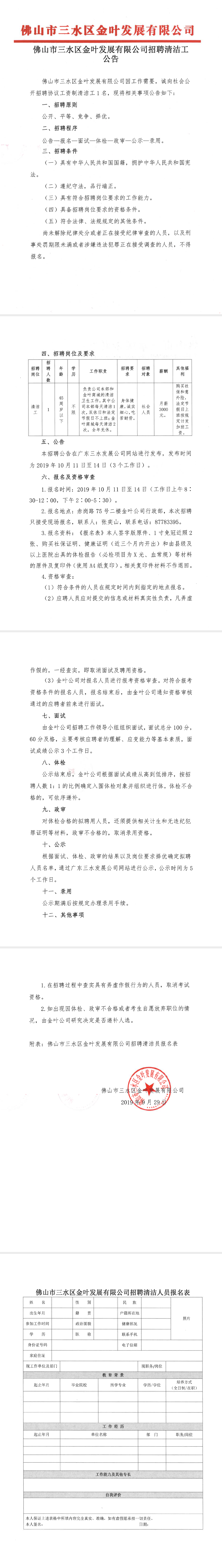 佛山市三水区金叶发展有限公司招聘清洁工公告