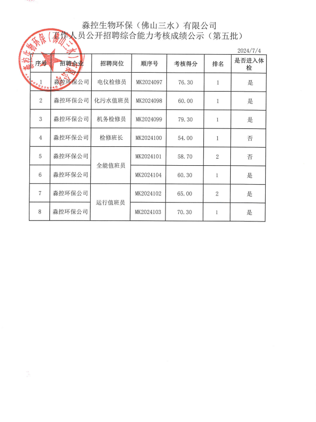 淼控生物环保(佛山三水)有限公司工作人员公开招聘综合能力考核成绩公示(第五批)