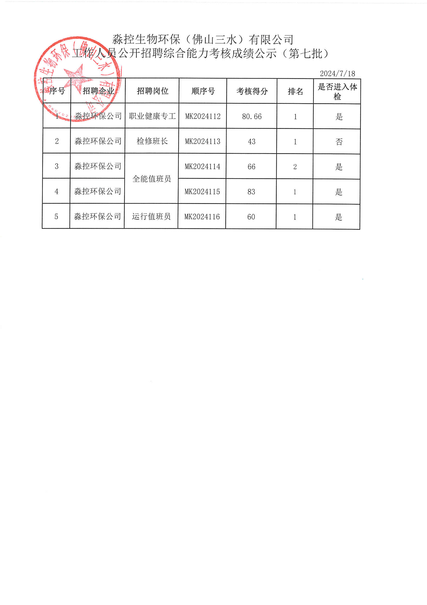 淼控生物环保(佛山三水)有限公司工作人员公开招聘综合能力考核成绩公示(第七批)