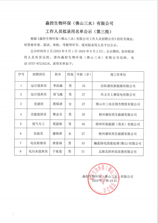 淼控生物环保(佛山三水)有限公司 工作人员拟录用名单公示(第三批)