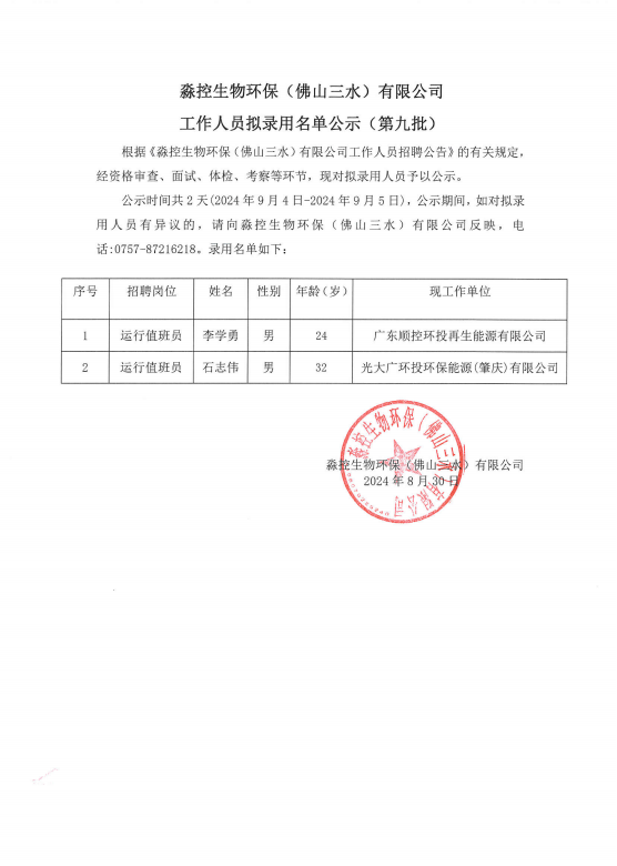 淼控生物环保(佛山三水)有限公司工作人员拟录用名单公示(第九批)