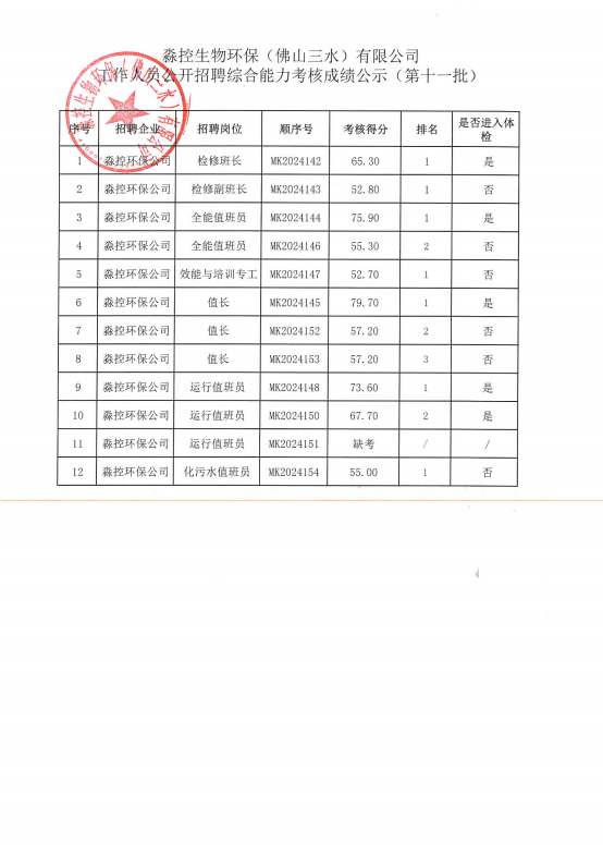 淼控生物环保(佛山三水)有限公司工作人员公开招聘综合能力考核成绩公示(第十一批)