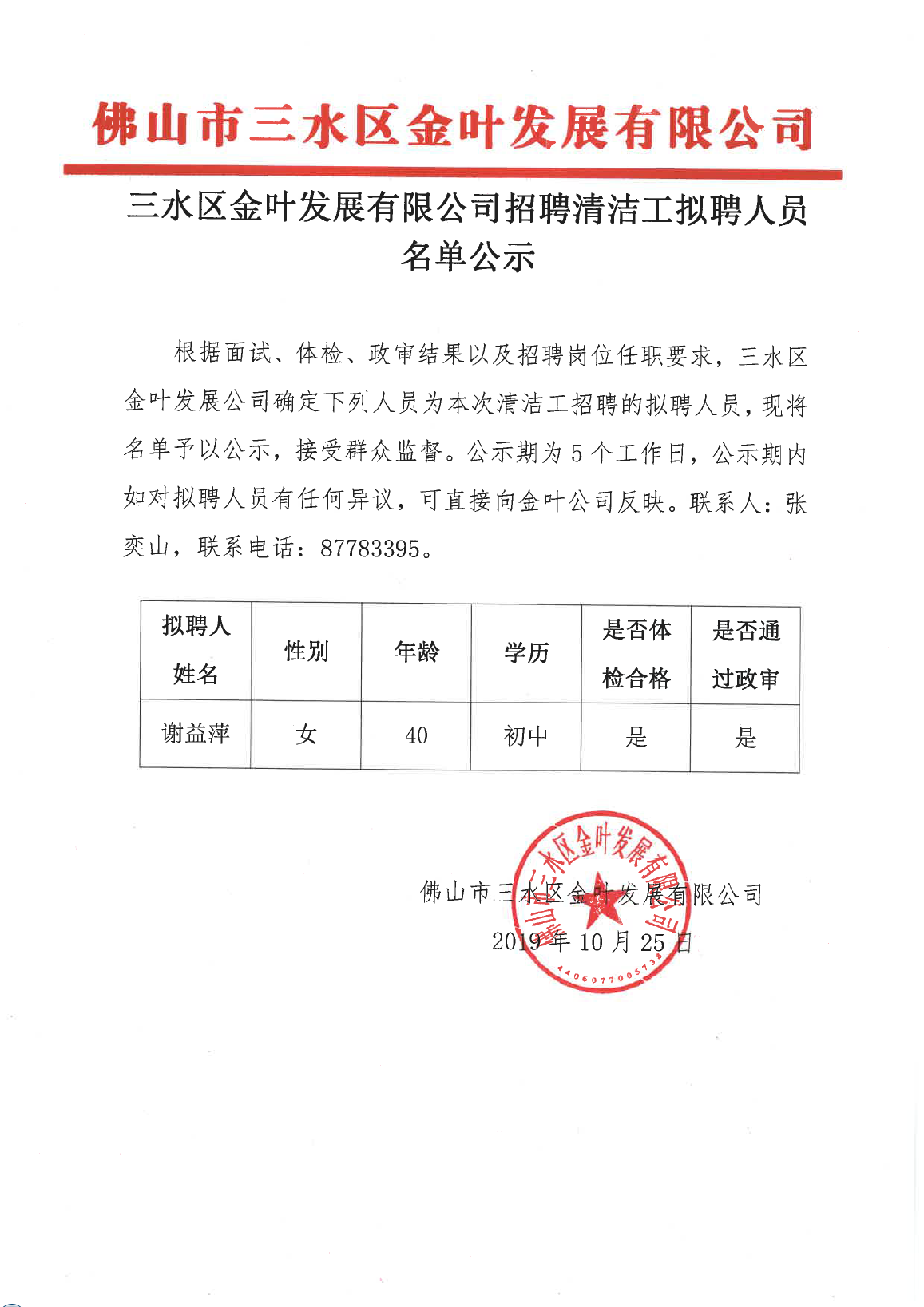 三水区金叶发展有限公司招聘清洁工拟聘人员名单公示