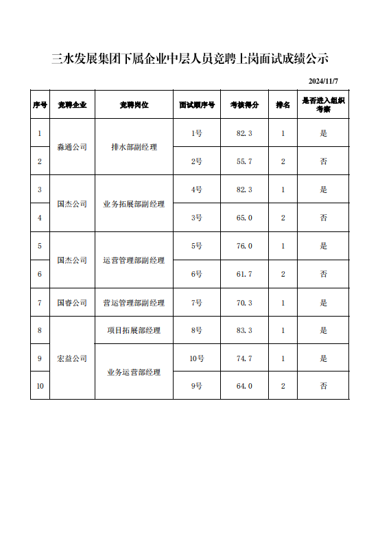 williamhill中文官网集团下属企业中层人员竞聘上岗面试成绩公示