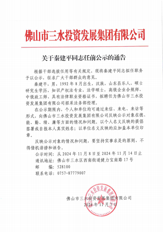 关于秦建平同志任前公示的通告