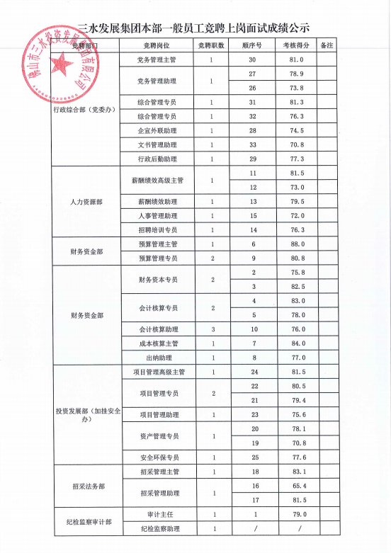 williamhill中文官网集团本部一般员工竞聘上岗面试成绩公示
