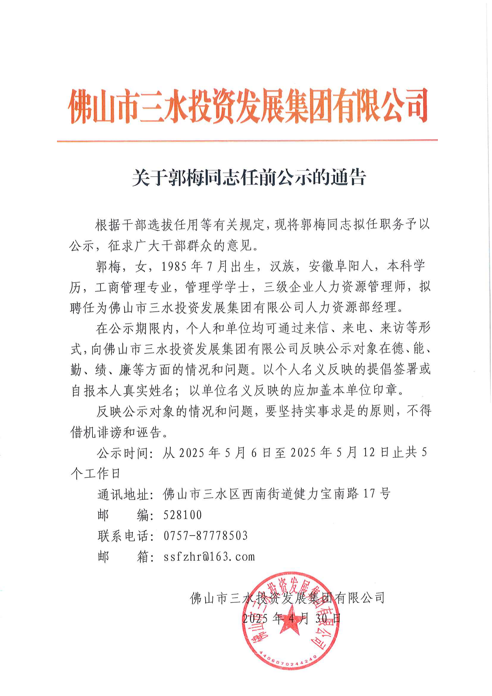 关于郭梅同志任前公示的通告