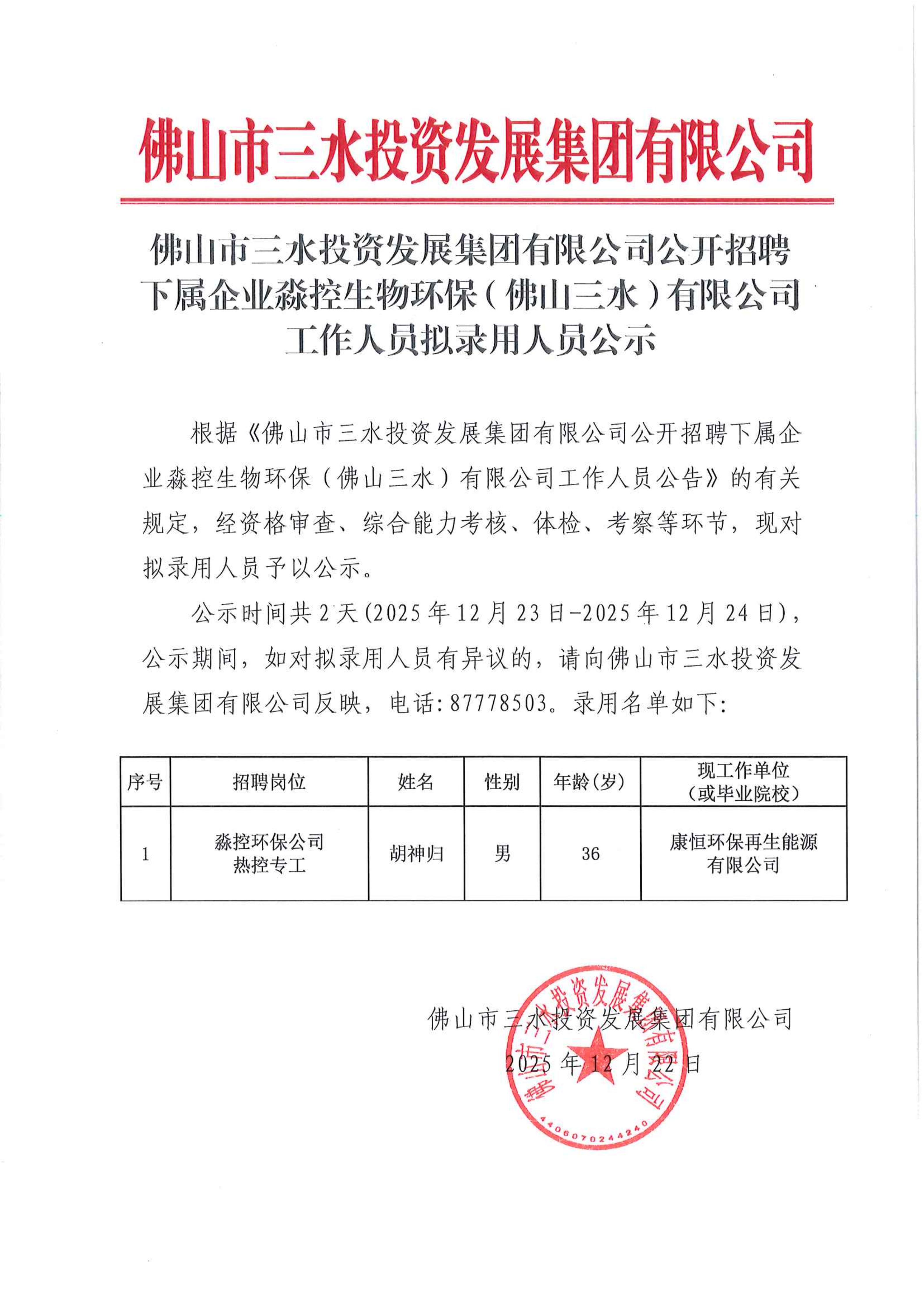 williamhill中文官网公开招聘下属企业淼控生物环保(佛山三水)有限公司工作人员拟录用人员公示