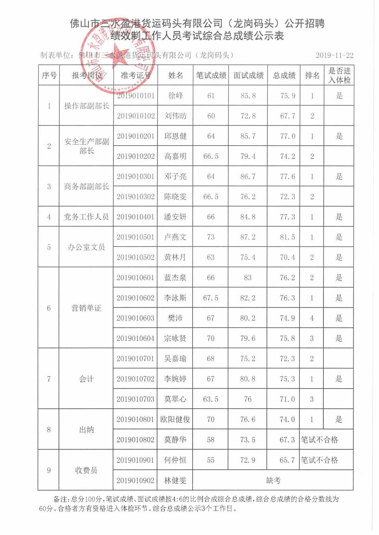 佛山市三水盈港货运码头有限公司(龙岗码头)公开招聘绩效制工作人员考试综合总成绩公示表