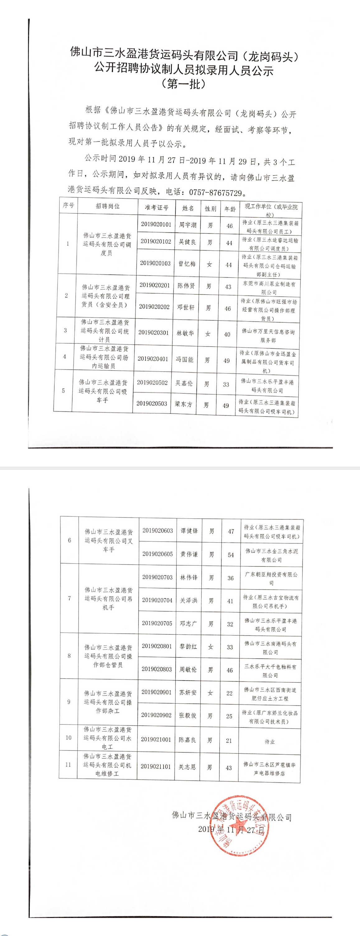 佛山市三水盈港货运码头有限公司(龙岗码头)公开招聘协议制人员拟录用人员公示(第一批)