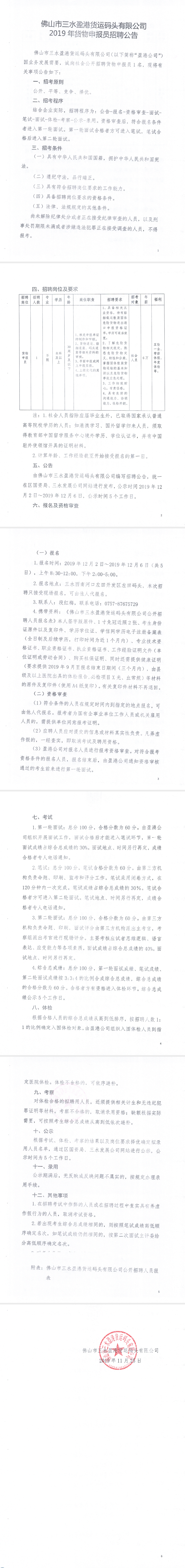 佛山市三水盈港货运码头有限公司2019年货物申报员招聘公告