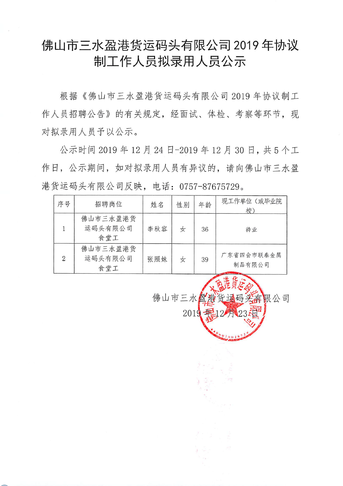 佛山市三水盈港货运码头有限公司2019年协议制工作人员拟录用人员公示