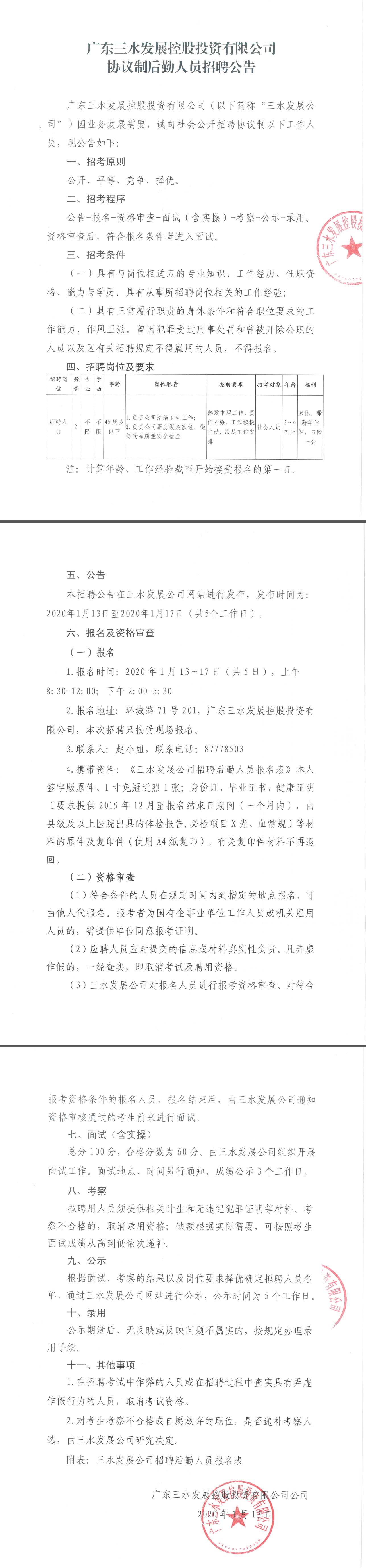 广东williamhill中文官网控股投资有限公司协议制后勤人员招聘公告