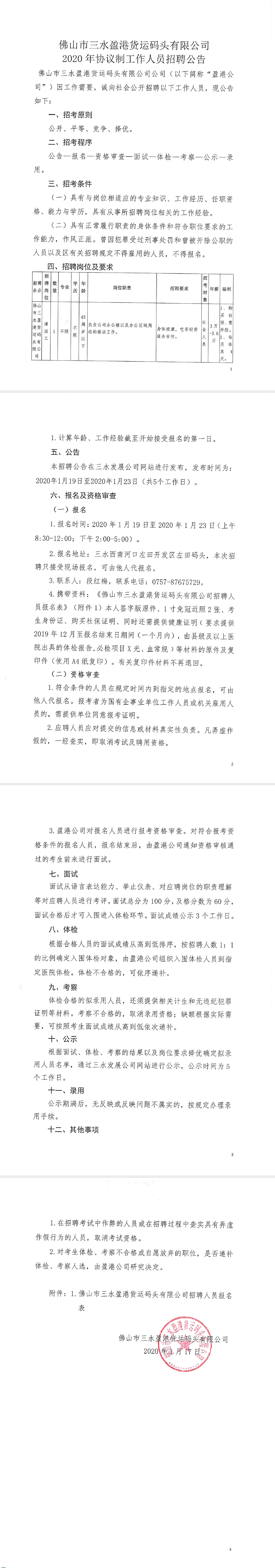 佛山市三水盈港货运码头有限公司2020年协议制工作人员招聘公告