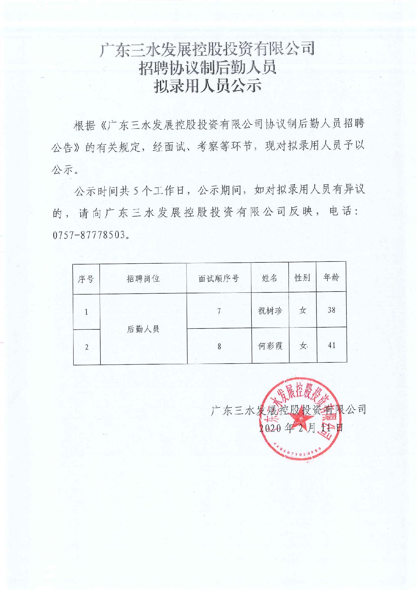 广东williamhill中文官网控股投资有限公司招聘协议制后勤人员拟录用人员公示