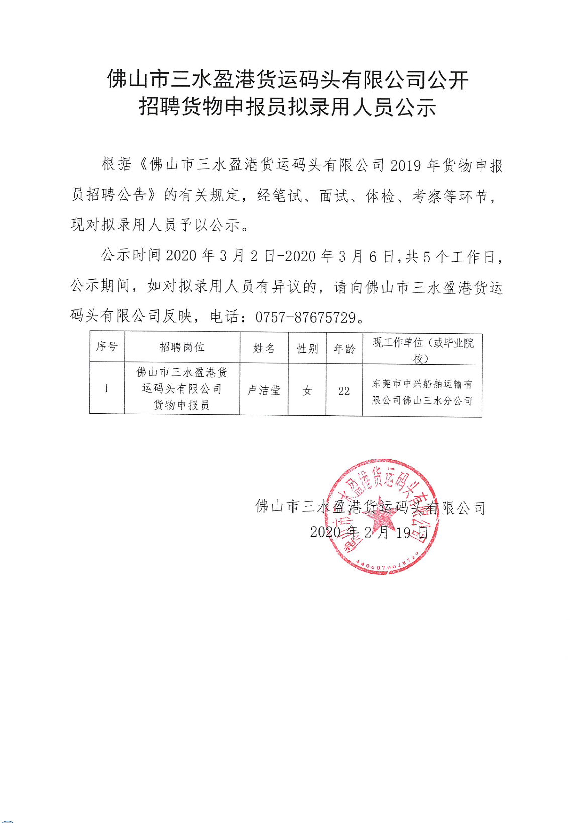 佛山市三水盈港货运码头有限公司公开招聘货物申报员拟录用人员公示