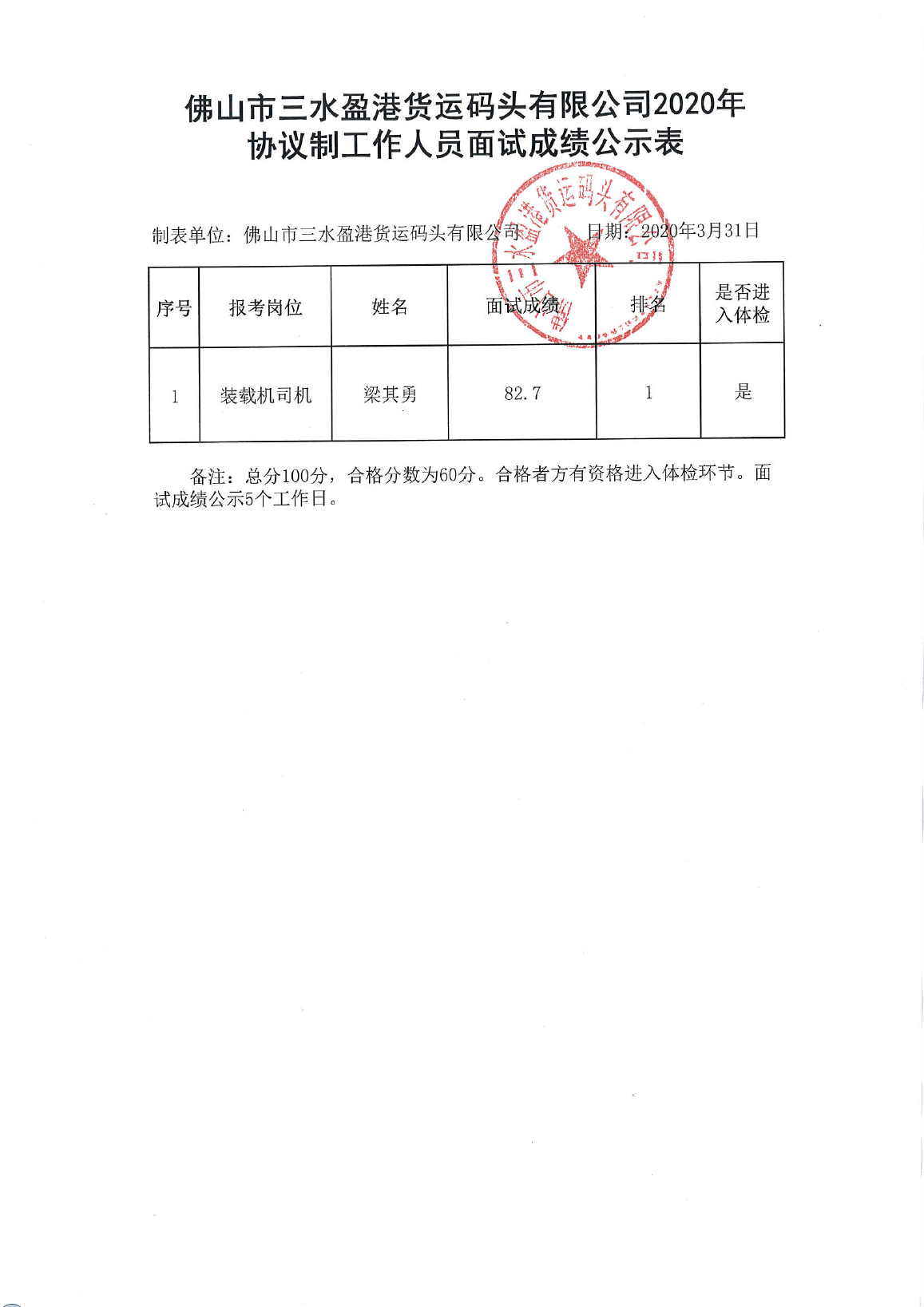 佛山市三水盈港货运码头有限公司2020年协议制工作人员面试成绩公示
