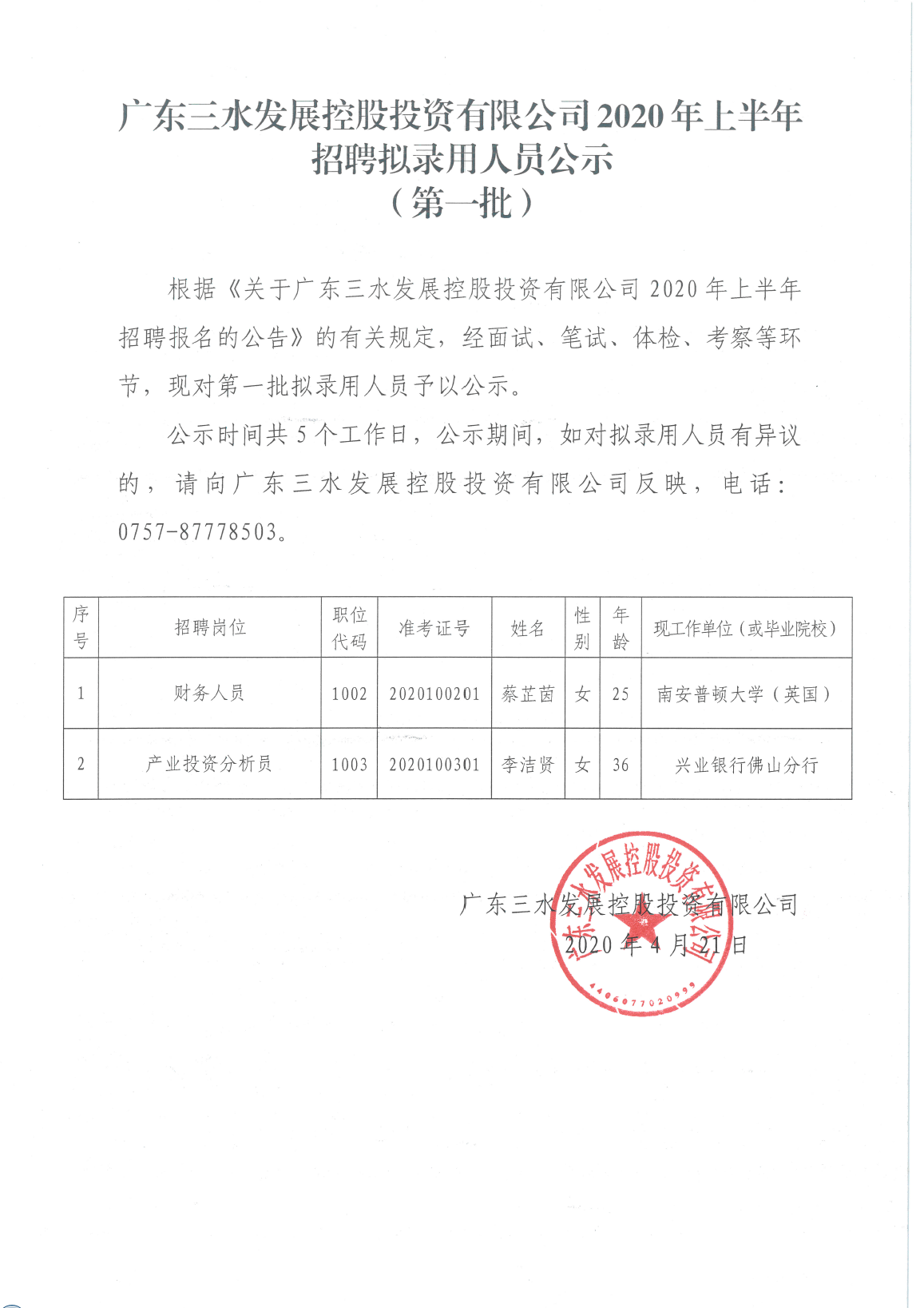 广东williamhill中文官网控股投资有限公司2020年上半年招聘拟录用人员公示(第一批)