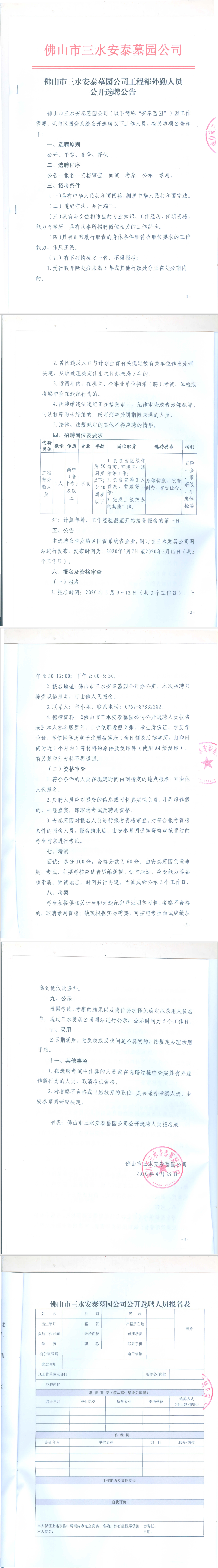 佛山市三水安泰墓园公司工程部外勤人员公开选聘公告
