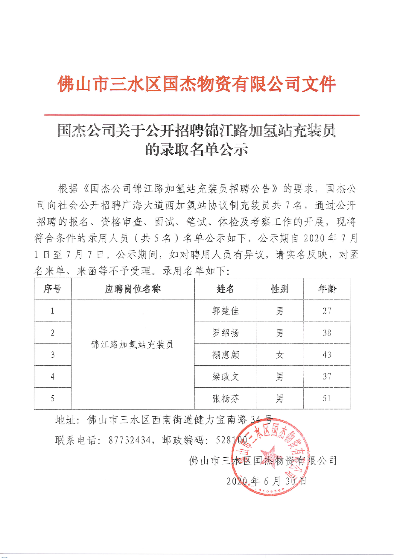 国杰公司关于公开招聘锦江路加氢站充装员的录取名单公示