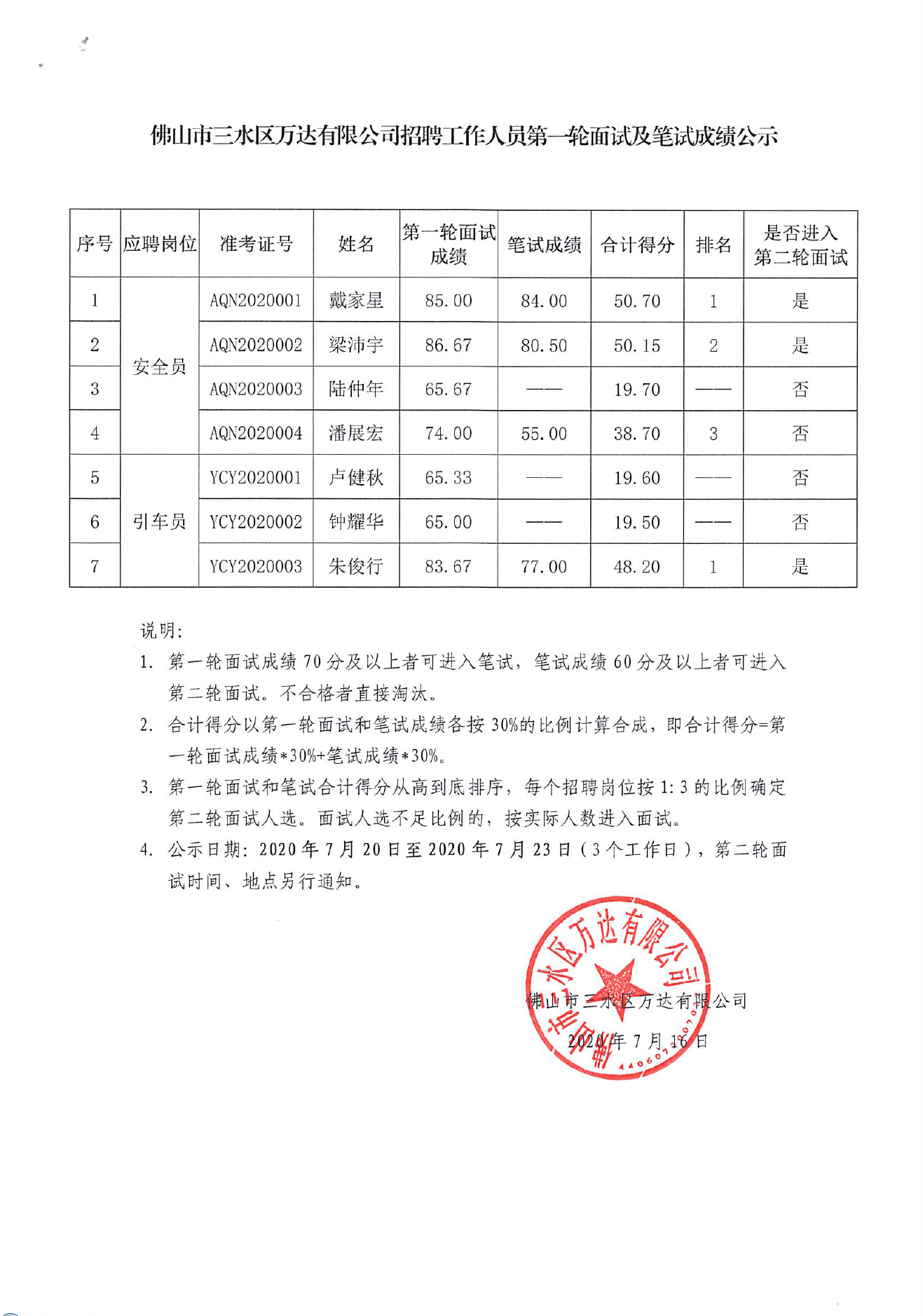 佛山市三水区万达有限公司招聘工作人员第一轮面试及笔试成绩公示
