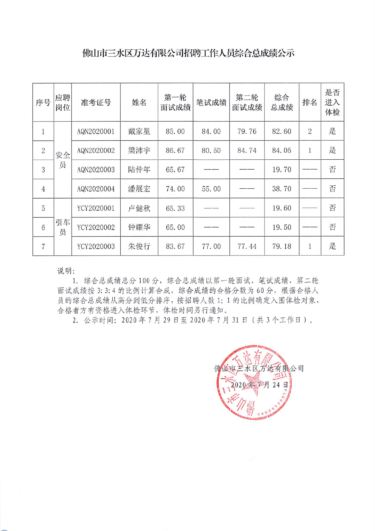 佛山市三水区万达有限公司招聘工作人员综合总成绩公示