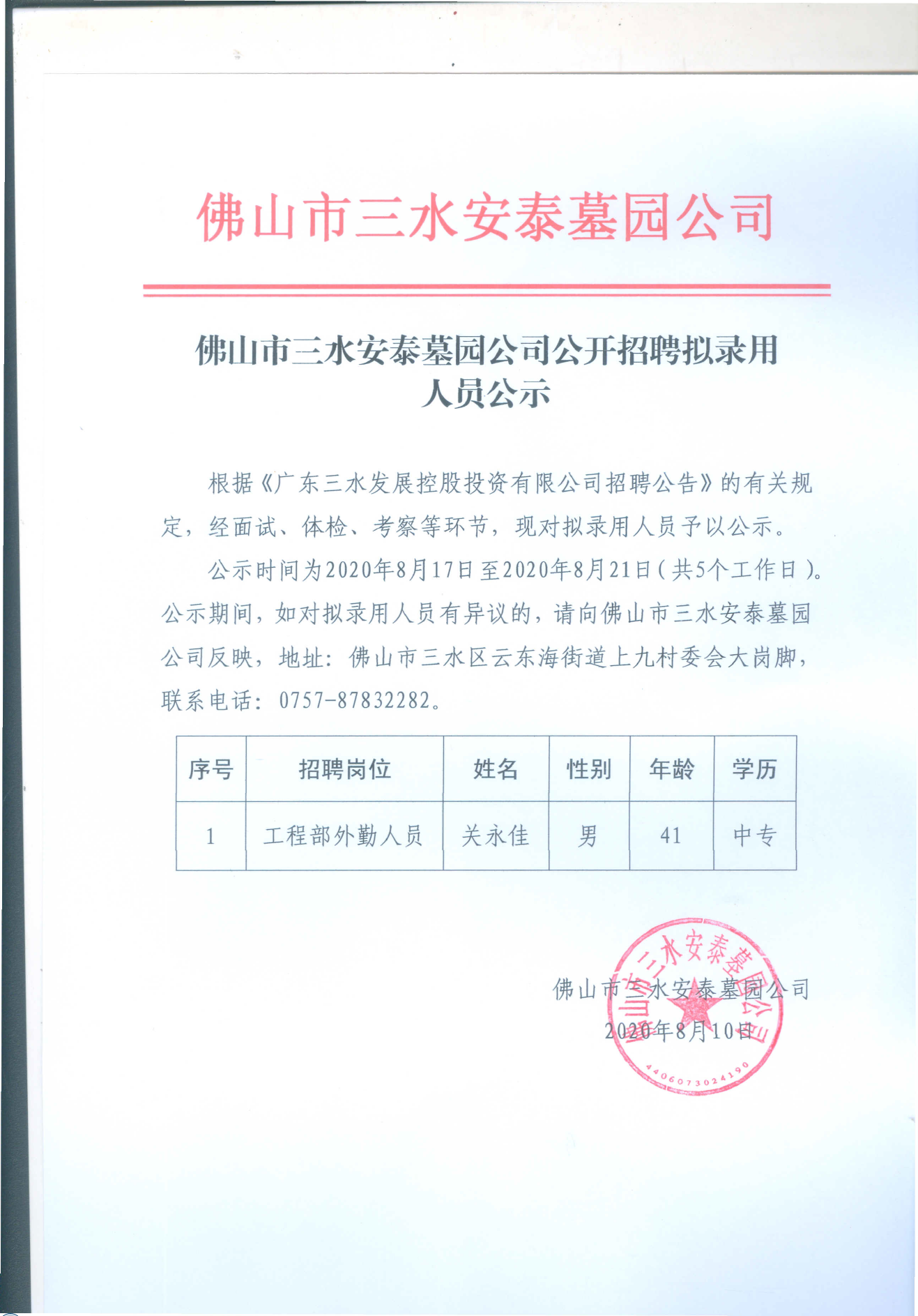 佛山市三水安泰墓园公司公开招聘拟录用人员公示